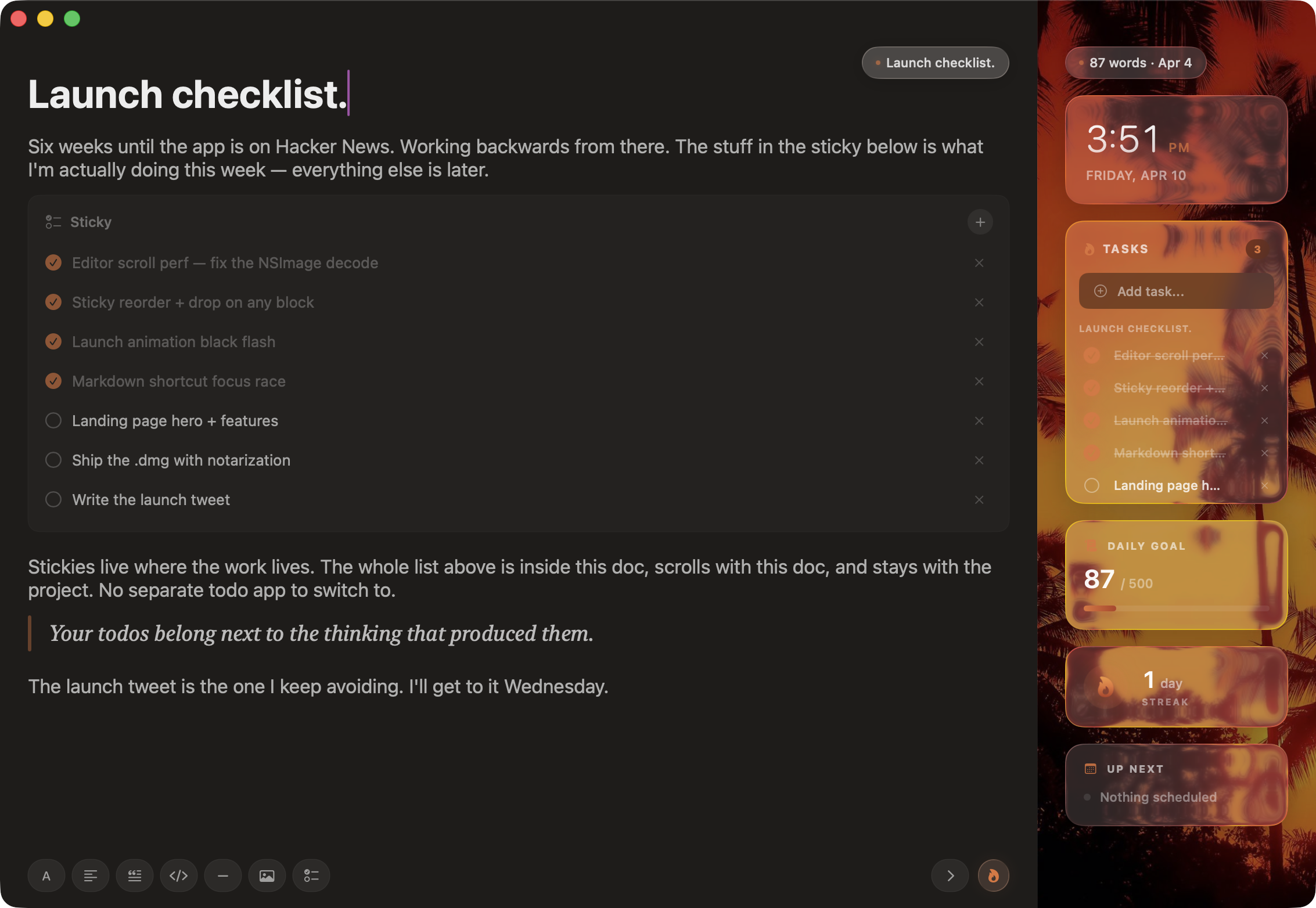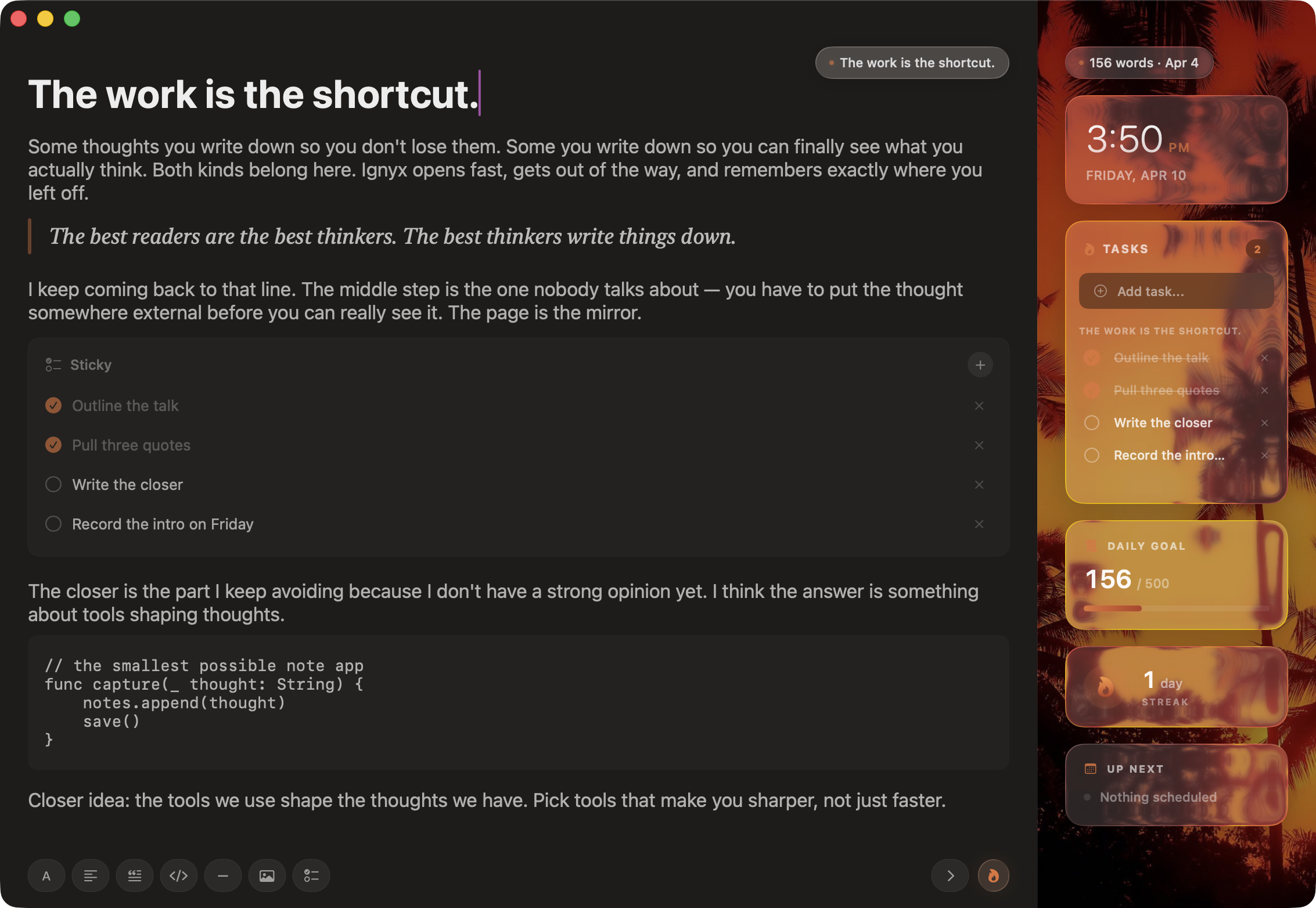 Ignyx is the app I wanted. Local-first because my notes are mine. Glass everywhere because macOS 26 finally lets you build chrome that feels like part of the OS. Sticky blocks inside docs because that's where my todos actually live. A menu bar capture because the best ideas come while you're doing something else.